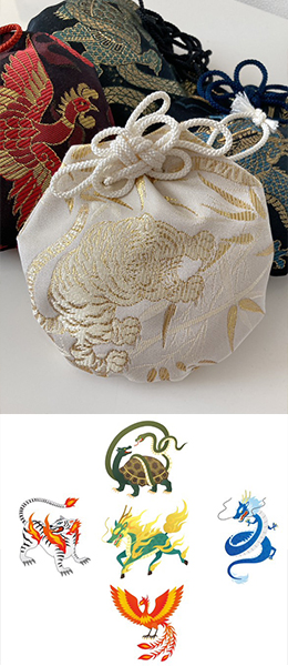 勝林寺の守り巾着は全部で4種類あります。今回はそのうちの一つ、「白虎」を作ります。江戸時代、帯などに着けて使うこの御守りを“守り巾着”と呼んでいました。掌サイズの少し大きめの匂い袋です。秋を司る白虎は金運を強化すると云われています。巾着の中には白虎をイメージした香りが入っています。壁に掛けたり、西の方角に飾って楽しんでください。